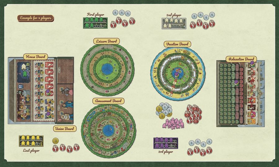 Each turn, place one (or more) of your workers on any available after-work spaces to gain relaxation. Taking leisure time doesn't cost anything, but going to town for amusement requires you to spend hard-earned money. Going on vacation for real relaxation is out of the question until your employer is convinced to grant your workers some time off. When your workers meet partners, you gain access to even better relaxation options.