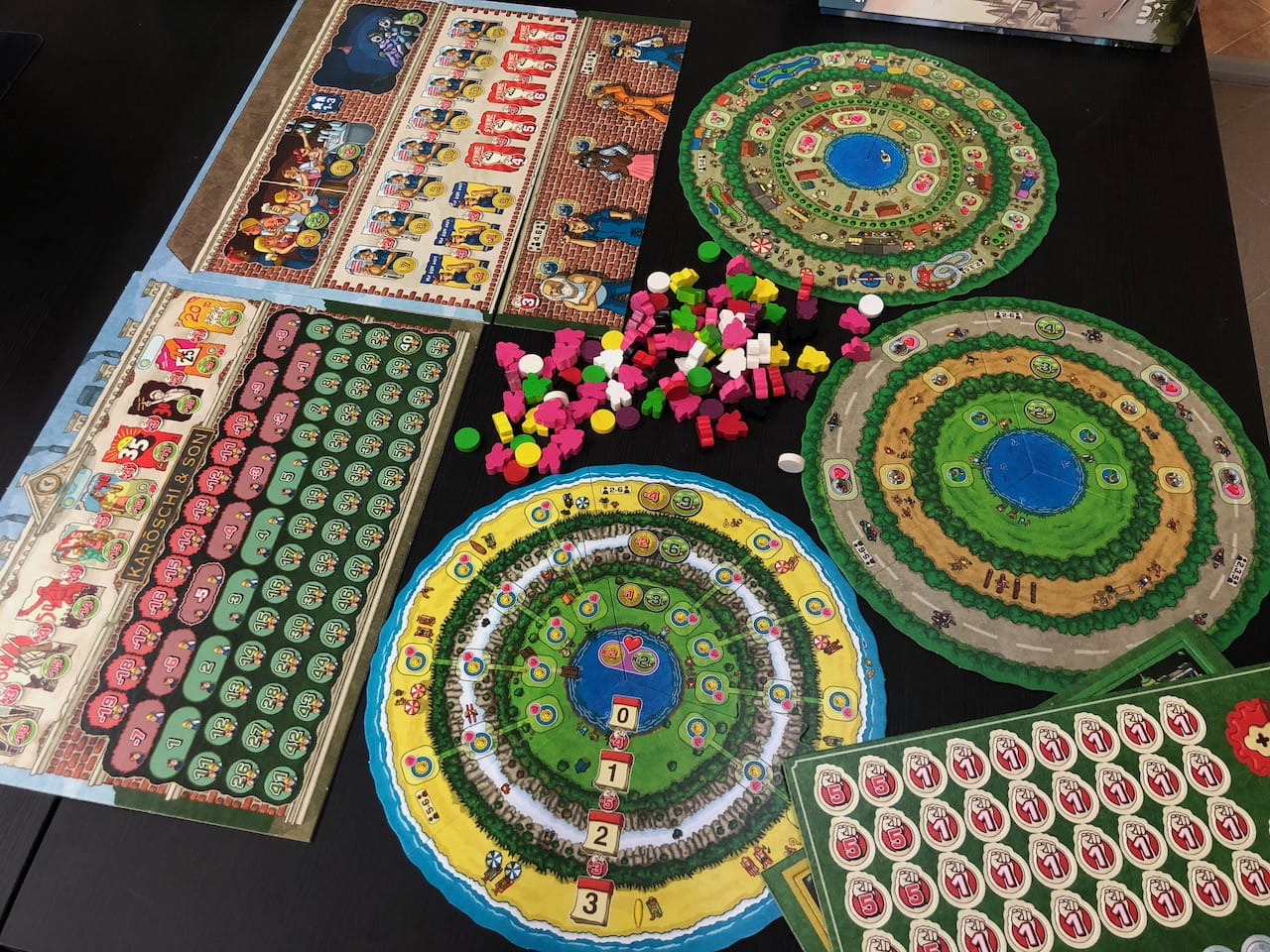 The end of the game is triggered once a team gathers at least 40 relaxation. (In this game, relaxation is considered to be a currency.) Your workers are then placed on after-work spaces and go back to work one more time, after which the most relaxed team wins Feierabend.