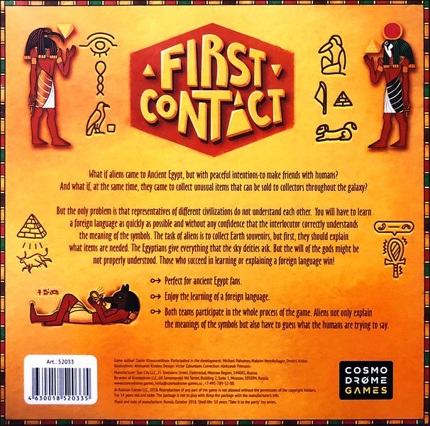 In each turn Aliens would draw weird symbols, trying to explain which earthly items they’d like to collect. Puzzled Egyptians are to figure out what this could mean. On top of that, Aliens compete for being the first to grab the souvenirs and fly back home, while each human wants to be the best at learning the Alien language!