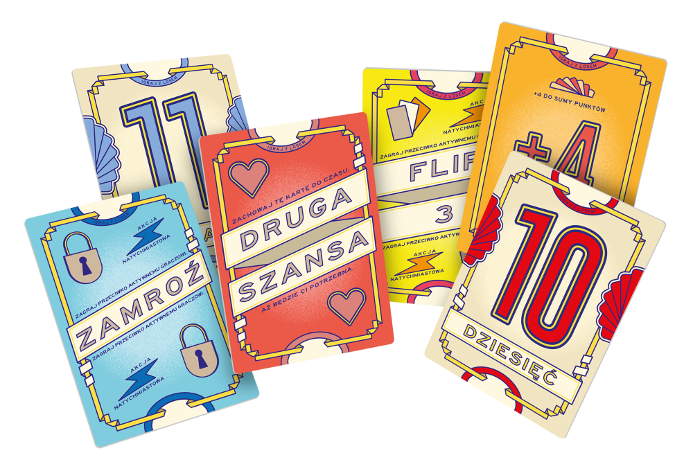 - Do zabawy wykorzystujemy specjalną talię kart z liczbami. Im większa liczba na karcie, tym więcej egzemplarzy tej karty znajduje się w talii. Oprócz tego kryją się tam specjalne karty modyfikatorów, które powiększają nasz dorobek punktowy, a także 3 rodzaje kart akcji, które mogą uratować nas w kryzysowej sytuacji, zmuszą jednego z graczy do dobrania aż 3 kart na raz albo pozwolą natychmiastowo zamrozić czyjąś rundę.