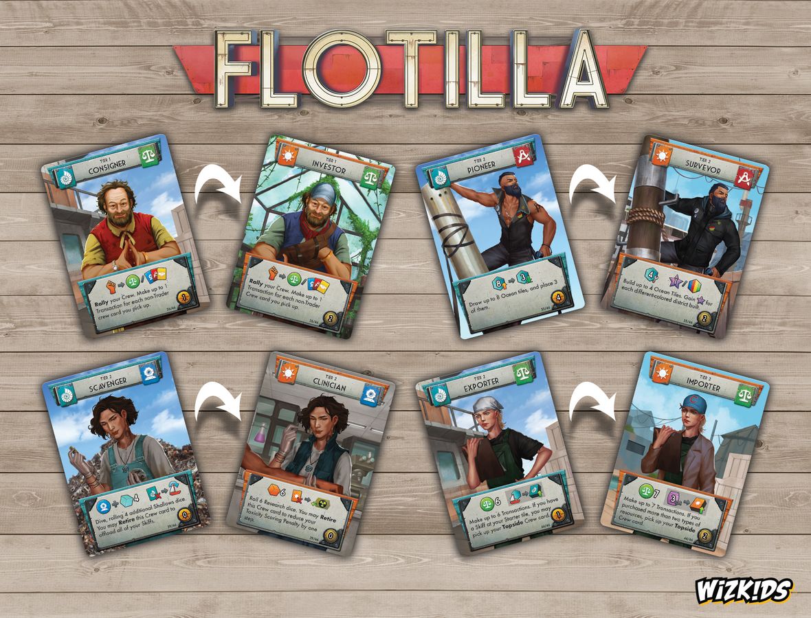 The choice of if or when to switch from a “Sinkside” explorer to a “Skyside” settler defines the very core experience of Flotilla. They represent two similar but distinct game experiences, utilizing the same game components, seamlessly intertwined among all players. If you switch, you’ll flip over all of your accumulated game components, watching your crew grow into new roles with new art for the same characters, while finding entirely new uses for your ocean tiles and resources, and beginning to trade with the “Sinkside” players as you go after new objectives. As players turn “Skyside,” different niches are filled, forever changing the game’s economy. Mastering this ebb and flow will be critical if you’re to shape the new face of humanity!