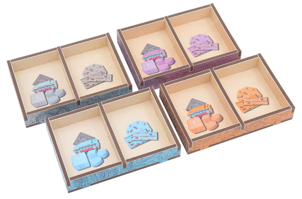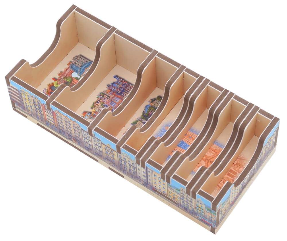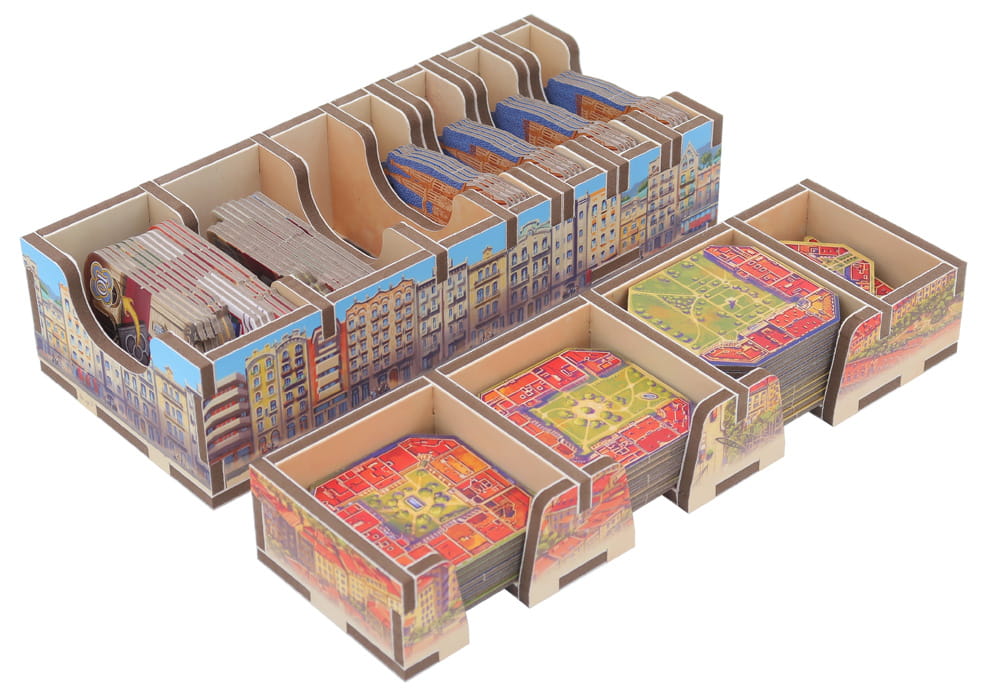Insert compatible with Barcelona®, including the Passeig de Gràcia® expansion. The design provides both efficient storage and improved game play. Many of the trays can be utilised during the game, and they greatly aid set-up and clear-away times. The rules and boards act as a lid on top of the trays.