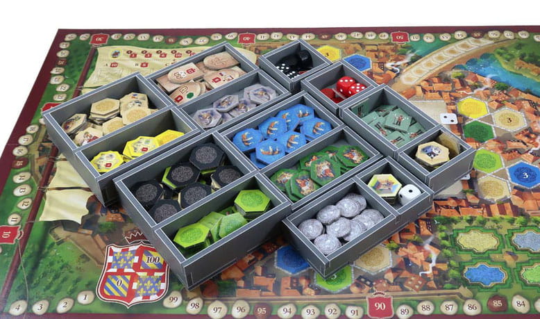 Insert compatible with Castles of Burgundy: Anniversary Edition®, and also has trays for The Card Game® version. The design provides both efficient storage and improved game play. The trays can be utilised during the game, and they greatly aid set-up and clear-away times. The rules and boards act as a lid on top of the trays.