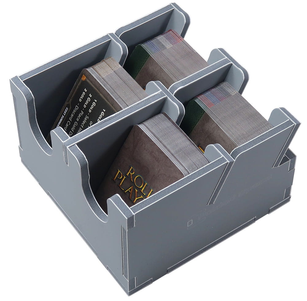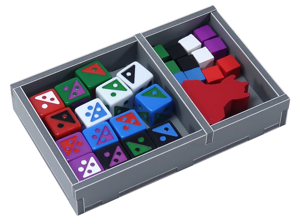 Insert compatible with Roll Player®, and Monsters & Minions® and Fiends & Familiars® expansions. The design provides both efficient storage and improved game play. Many of the trays can be utilised during the game, and they greatly aid set-up and clear-away times. The standard game dice are stored in the dice bag as shown.