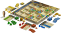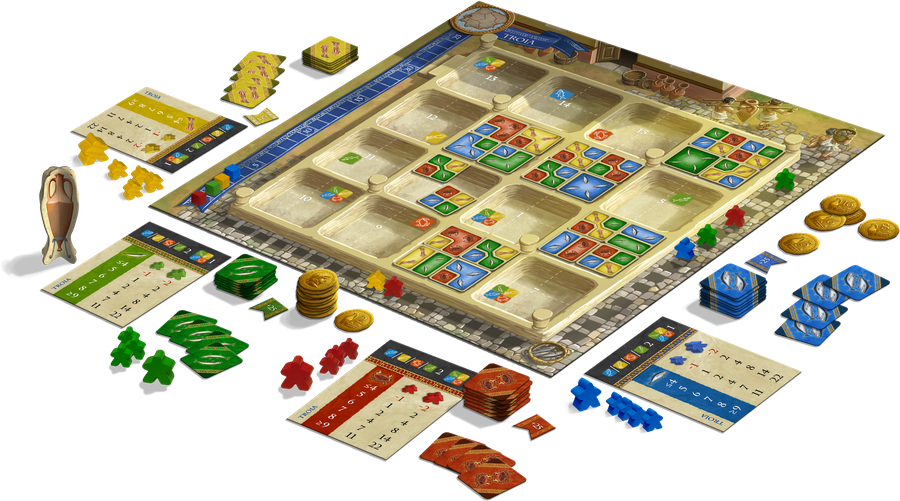 In Garum, each player represents a master in the preparation of a specific type of fish sauce and receives a set of 16 Cetarian Tiles; each one has 4 spaces filled by 4 colors in different proportions, though the color that the player is defending is the predominant one.