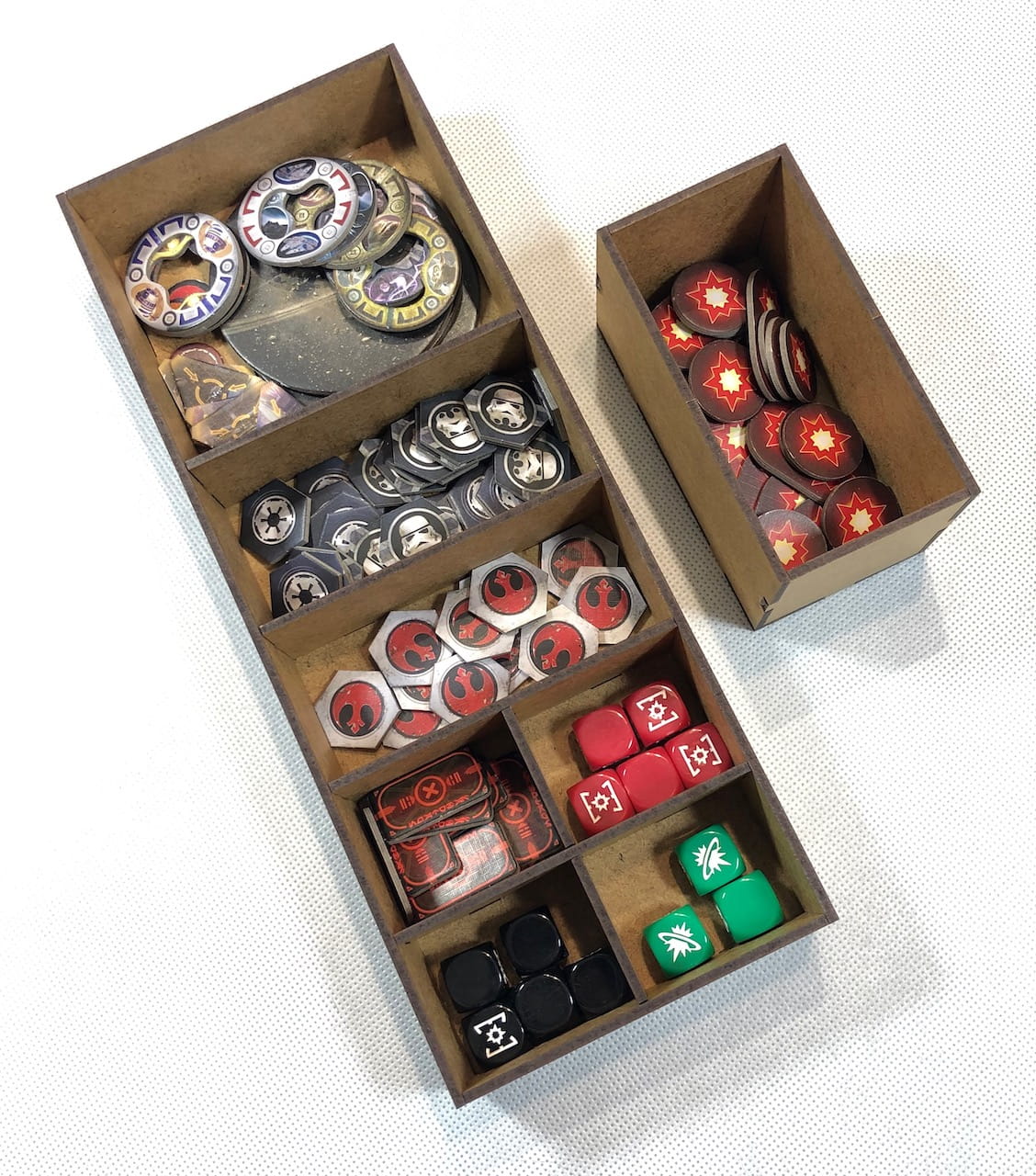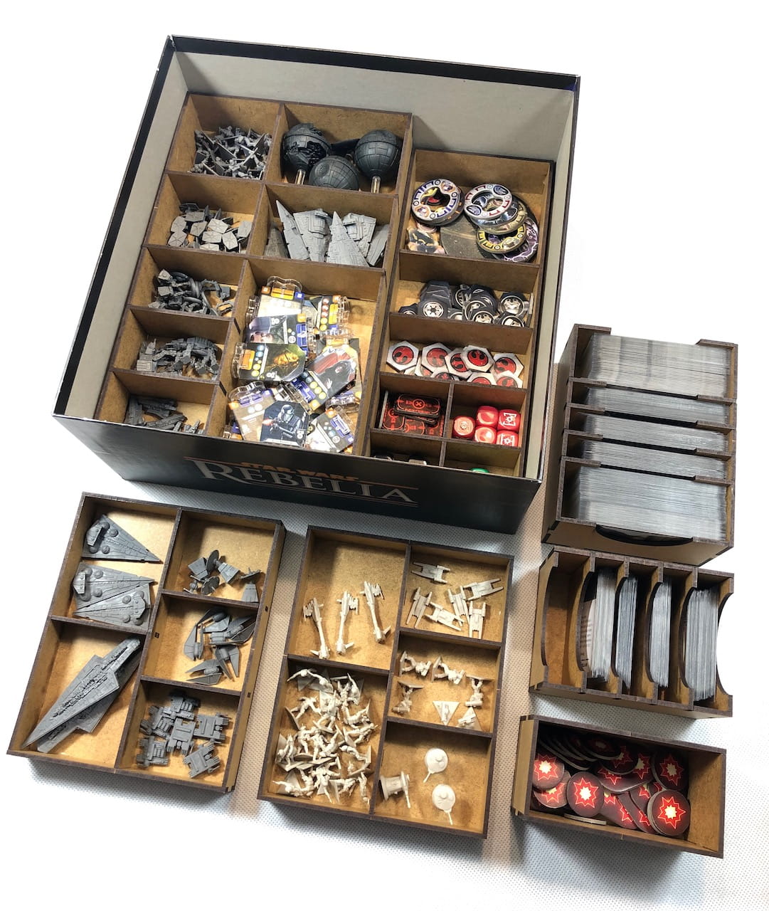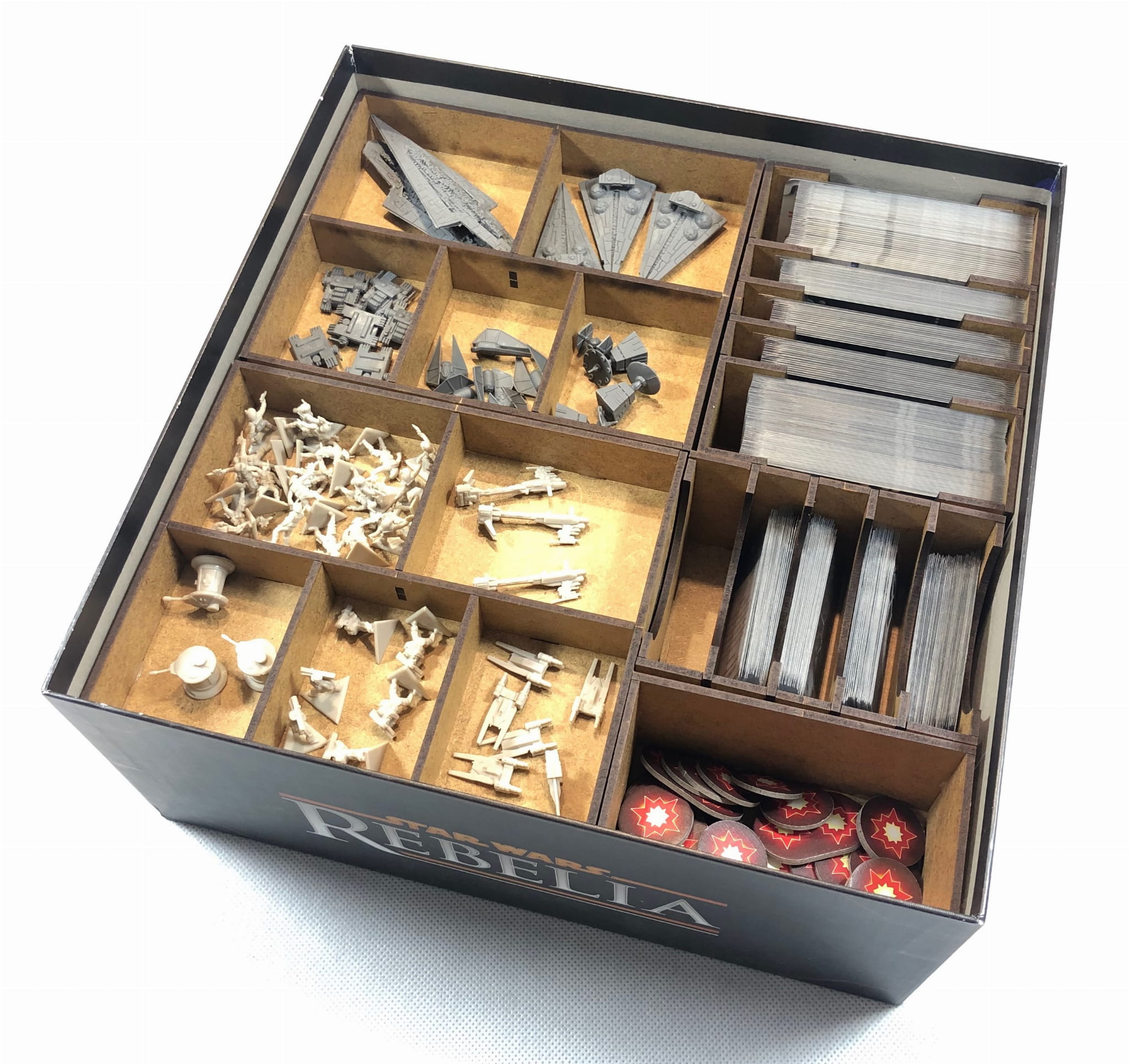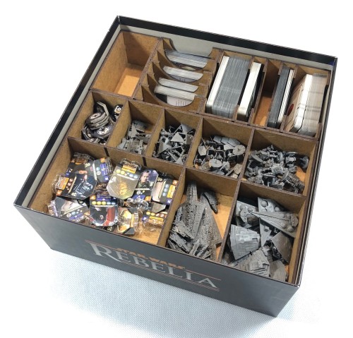 Insert pasujący do gry Star Wars: Rebelia. Insert pomieści wszystkie komponenty znajdujące się w podstawowej wersji gry wraz z dodatkiem Imperium u władzy. Insert pomieści karty w koszulkach.