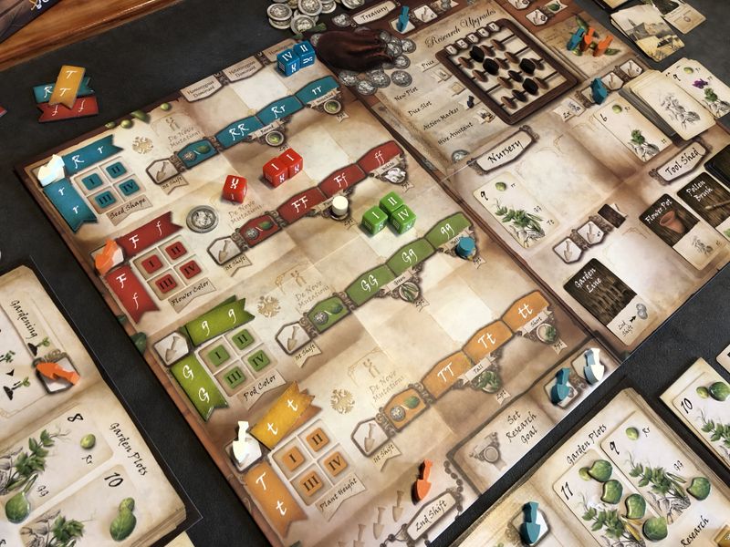 During the game, players get Pea Plant Cards which show a set of Phenotype Traits they hope to produce and collect (such as pink flowers and tall height) in order to score points. Each round, Dice are rolled to represent Plant breeding, which may result in the Traits players are looking for. After the Dice Roll, players take turns drafting Dice towards completing their Pea Plant Cards or advancing their Research. The Traits produced during the Dice Roll come through the science of Punnett Squares, which show how the parent genes combine, one from each parent plant. By changing the genes of these parent plants, players can influence the likelihood of rolling the Traits they need. The completion of Pea Plant Cards via the Dice Draft is the main way players score points.