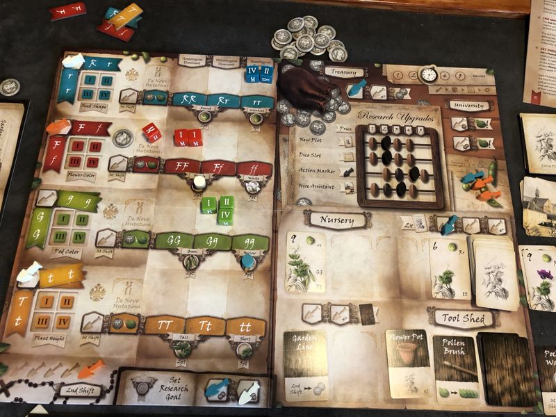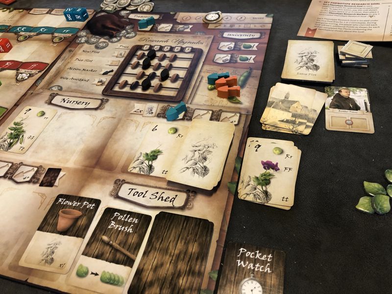 During the game, players get Pea Plant Cards which show a set of Phenotype Traits they hope to produce and collect (such as pink flowers and tall height) in order to score points. Each round, Dice are rolled to represent Plant breeding, which may result in the Traits players are looking for. After the Dice Roll, players take turns drafting Dice towards completing their Pea Plant Cards or advancing their Research. The Traits produced during the Dice Roll come through the science of Punnett Squares, which show how the parent genes combine, one from each parent plant. By changing the genes of these parent plants, players can influence the likelihood of rolling the Traits they need. The completion of Pea Plant Cards via the Dice Draft is the main way players score points.