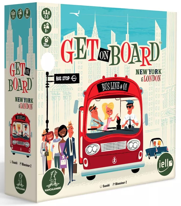 In Get on Board: New York & London, you have twelve rounds in which to build the best bus line in town. Each round reveals a new card that shows each player the route shape they must complete. Place your bus accordingly on the central board. Take the passengers where they want to go by connecting them and their destination to your bus line, avoid traffic, and gain as many victory points as possible!