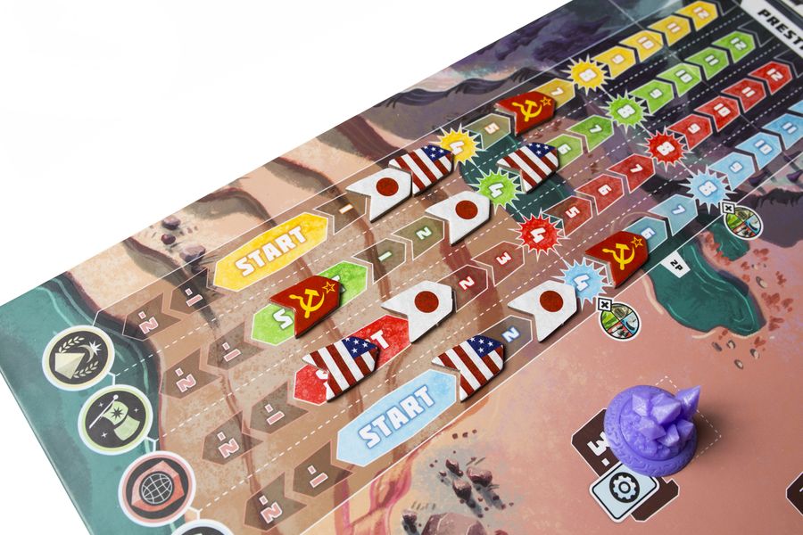 Godspeed is a mid-weight worker placement game of extra-terrestrial colonization for 2-5 players with a 60-90 minute playtime. In Godspeed, players play as scientists from one of 5 nations: the USA, Japan, Soviet Union, the European Nations, or India. The game is played in 10 rounds, each with four phases.