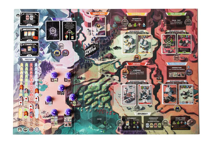 Points -- Prestige is gained on 4 tracks (Defense, Exploration, Commerce, and Infrastructure) and your position on these tracks gains you points at the end of the game. You may also gain points by achieving Civilization Milestones (only 1 Nation may claim each Milestone), completing Lunar Season scoring cards (any number of Nations may complete these), building ancient XenoRelics, completing special objective cards, and for left over resources.