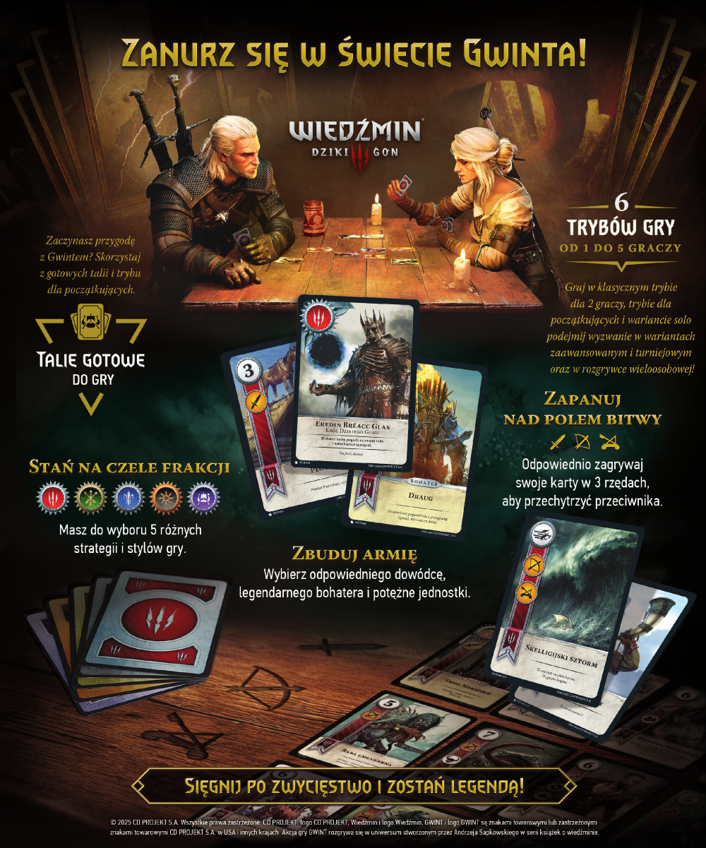 Odpocznij od walki z potworami, usiądź na chwilę przy stole i spróbuj swoich sił w Gwincie – kultowej karciance ze świata Wiedźmina! Stań na czele jednej z 5 frakcji, wybierz odpowiedniego dowódcę i zbuduj armię w oparciu o potężne jednostki, by zapanować nad polem bitwy i zdobyć przewagę, która przesądzi o losach rozgrywki.