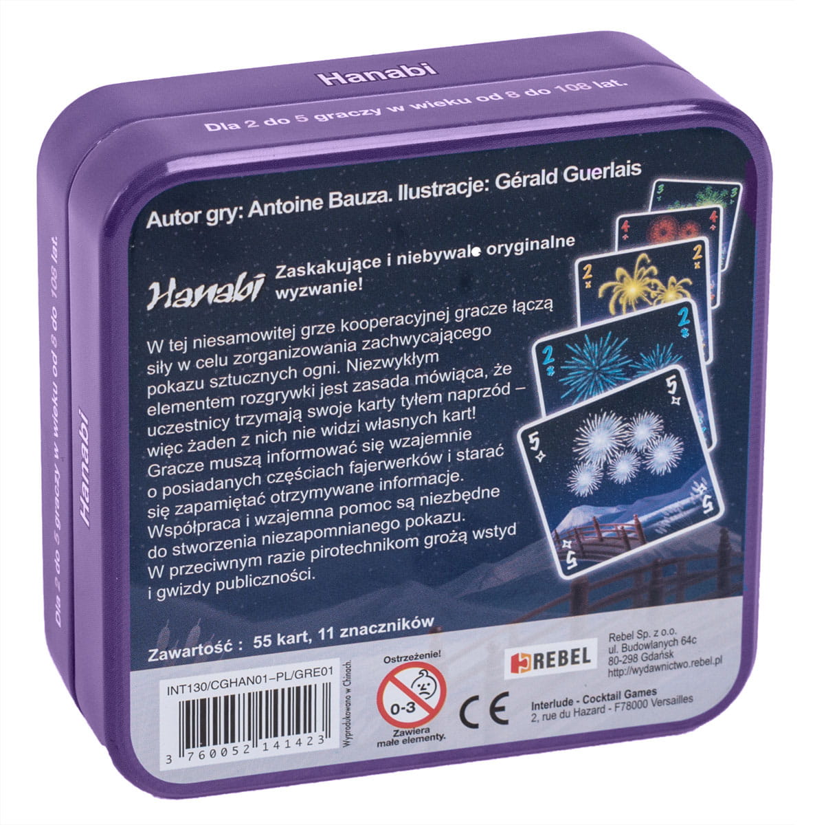 Jeżeli szukasz małej, taniej , a zarazem oryginalnej karcianki, to prawdopodobnie Hanabi jest dla Ciebie. Na pierwszy rzut oka nie wygląda zachęcająco - kilkadziesiąt kart ponumerowanych od 1 do 5 w kilku kolorach, kilka żetonów i temat z kosmosu. To tylko pozory, bo pod tym płaszczykiem kryje się interesująca gra. Prosty pomysł (widzimy tylko karty przeciwników), a dzięki niemu powstała jedyna w swoim rodzaju gra kooperacyjna, w której gracze wspólnie grają o najlepszy wynik. Szybka, prosta w zasadach, ale niełatwa, nie zajmuje zbyt dużo miejsca i skutecznie rozprawia się z problemem lidera, na który cierpi większość gier kooperacyjnych. Specyfika rozgrywki może nie wszystkim przypaść do gustu, ale to zależy jak restrykcyjne zasady przyjmiemy.