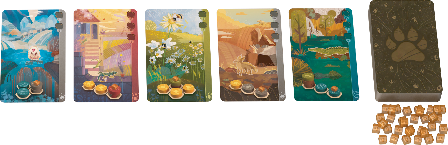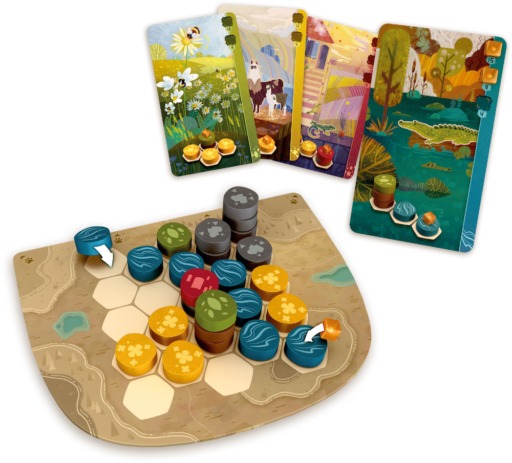 - Kolory oraz symbole żetonów reprezentują różne rodzaje terenów, a odpowiednie ich zestawy – siedliska. To właśnie na tych ostatnich będziemy się skupiać, by przyciągnąć zwierzęta.