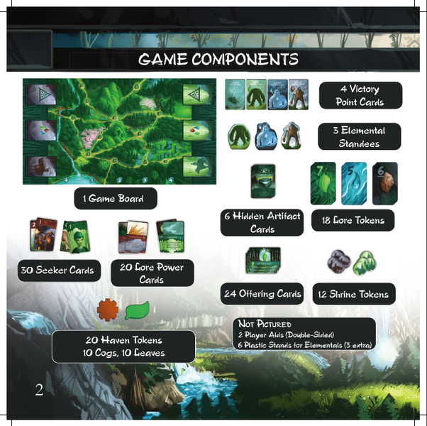 To obtain the power needed to oppose your enemy, you must send seekers to compete for the lore controlled by elementals, ancient beings who bestow the lore on those who seek it. Seekers also engage in combat for control of shrines on the board, scoring you bonus points if you occupy a majority of shrines surrounding forest havens. When one type of lore is depleted or one elemental has left the board, the Haven Guardian awakens and the player with the higher score masters the forest — or defends it from harm — and wins the game.