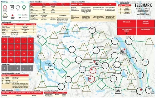 This is a solitaire game in the Raider series. Cards generate missions targeting parts of the German heavy water complex. You recruit SOE agents, British commando teams, and Norwegian resistance forces, along with various types of weapons and equipment.