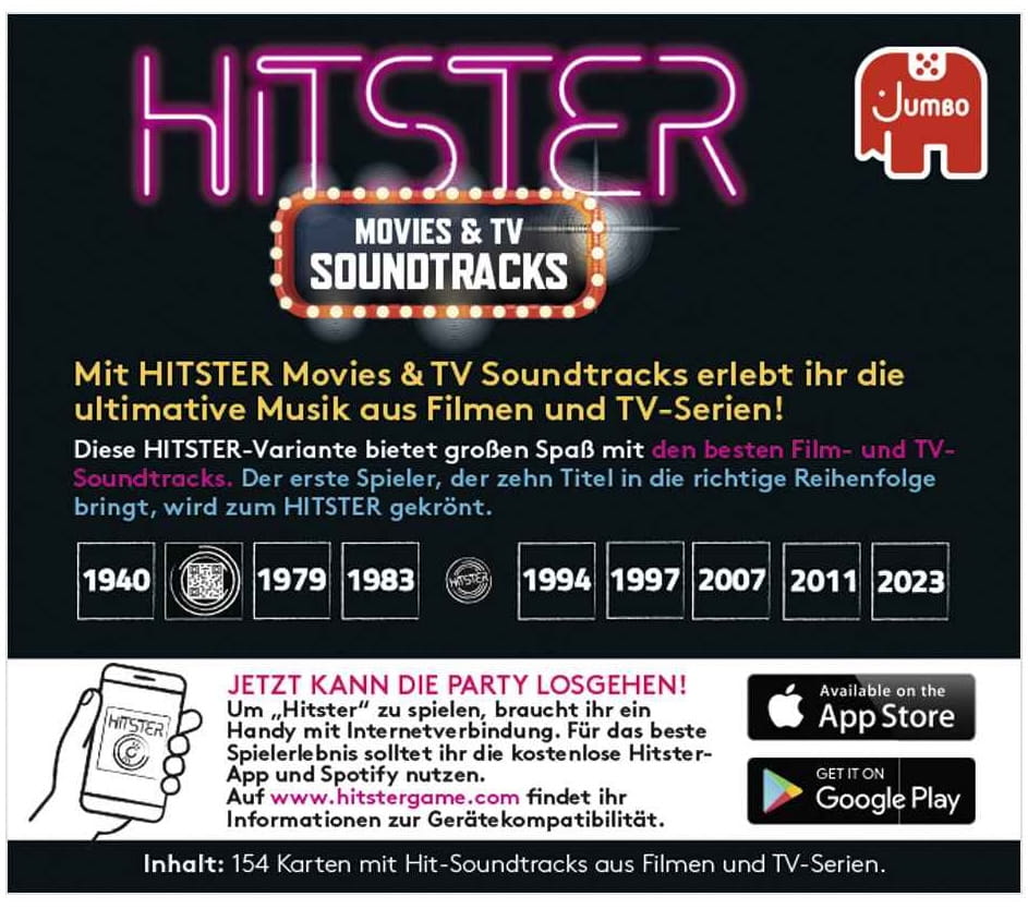 Imagine: You're sitting comfortably on the couch, the credits are rolling, and suddenly you hear the first notes of your favorite film soundtrack. It's exactly this feeling of nostalgia and excitement that our latest Hitster expansion brings to the gaming table. With cards covering the unforgettable tunes from films and series of the last decades, you can test your knowledge and have a lot of fun.