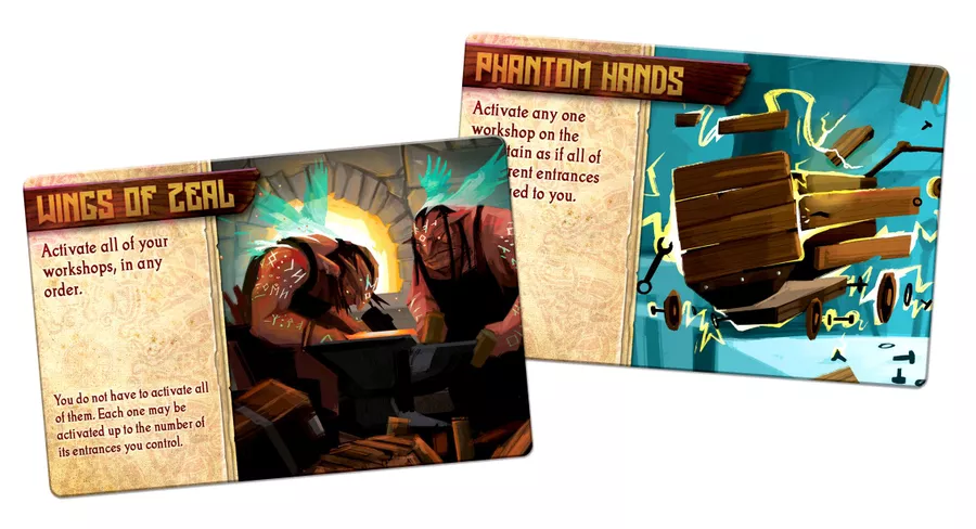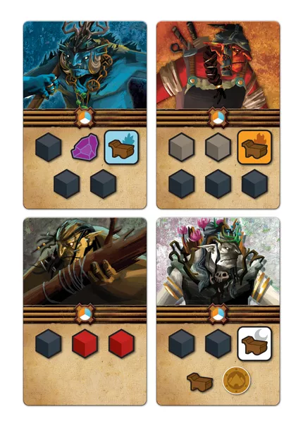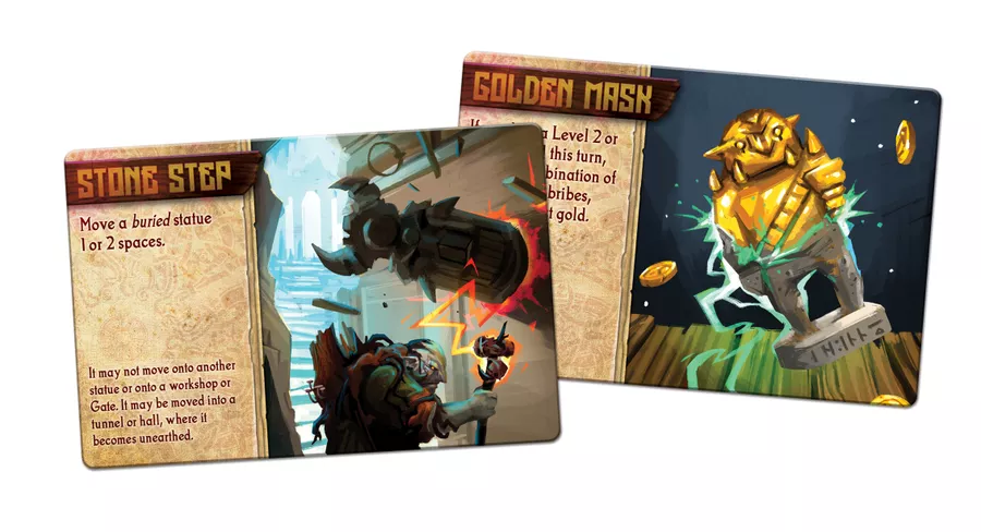 Working on the same game board with the other players (but beginning at your own entrance), you'll dig a competing network of tunnels by spending increasingly valuable materials to lay polyomino tiles onto the map. You want to extend your tunnels to connect with buried gold and materials, with workshop locations that can transform resources, and especially with toppled statues. Statues are key to scoring, and you'll spend carts to move them through the tunnels to prime scoring locations near the heart of the mountain.