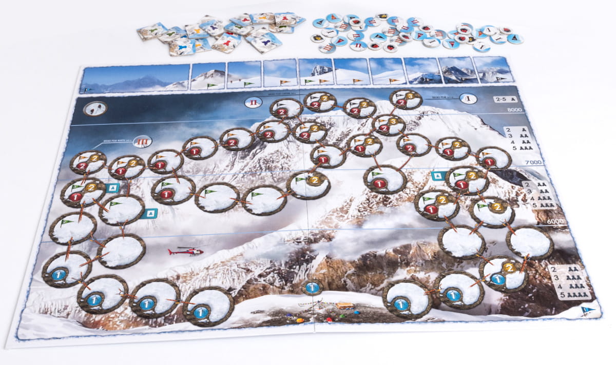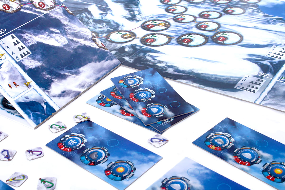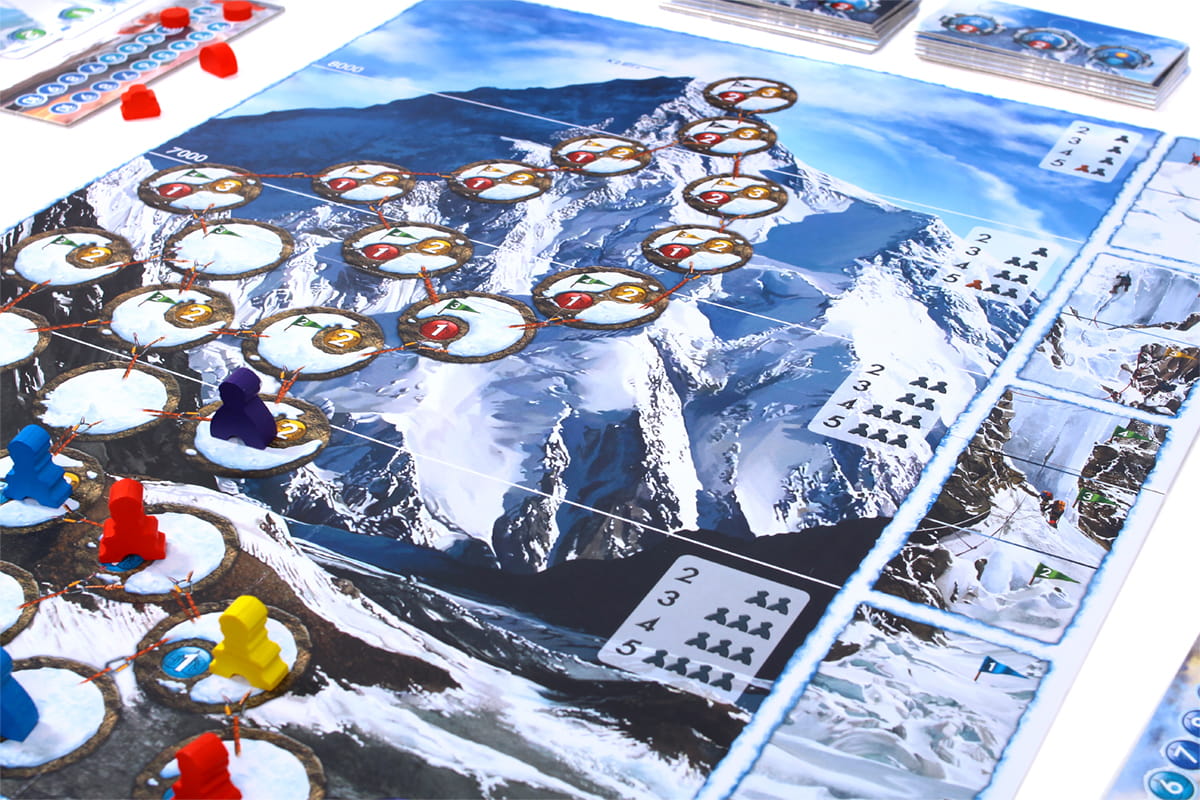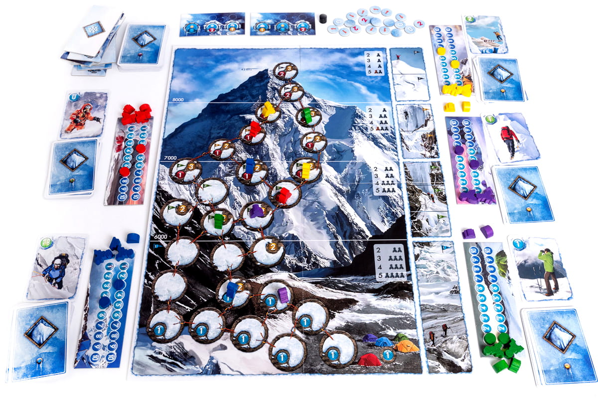 - Oprócz samej wspinaczki i wyboru odpowiedniej trasy, w grze ważna jest aklimatyzacja, czyli to, jak nasi himalaiści znoszą rosnącą wysokość i zmienne warunki pogodowe. Akcje obozowania oraz efekty kart pozwalają nam zwiększać ich bezpieczeństwo i szanse na przetrwanie.