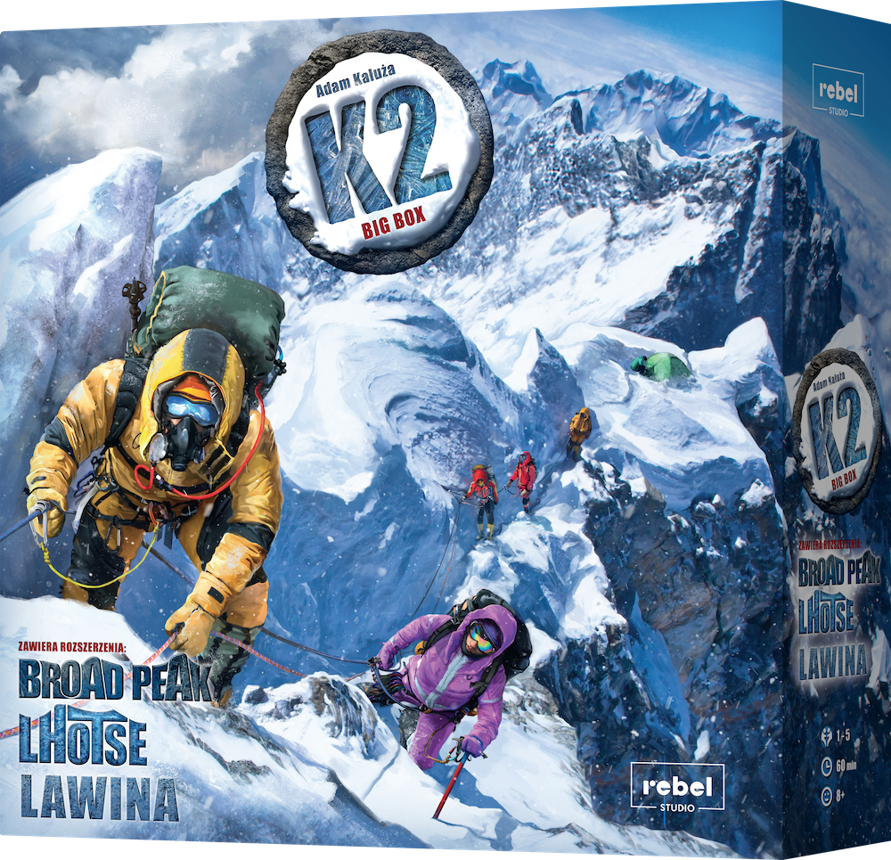 K2 to rodzinna gra planszowa, w której uczestnicy kierują dwuosobowymi zespołami himalaistów i próbują zdobyć tytułowy szczyt, a następnie bezpiecznie zejść na dół. W tym celu będziemy musieli wybrać odpowiednią drogę, zadbać o kondycję naszych wspinaczy oraz ich zaadaptowanie do zmiennych warunków pogodowych. W pudełku K2: Big Boxoprócz gry podstawowej znajdziesz trzy ekscytujące rozszerzenia: Broad Peak, Lhotse (każde z nich zawiera dwie nowe trasy wspinaczki) oraz mini dodatek Lawina!