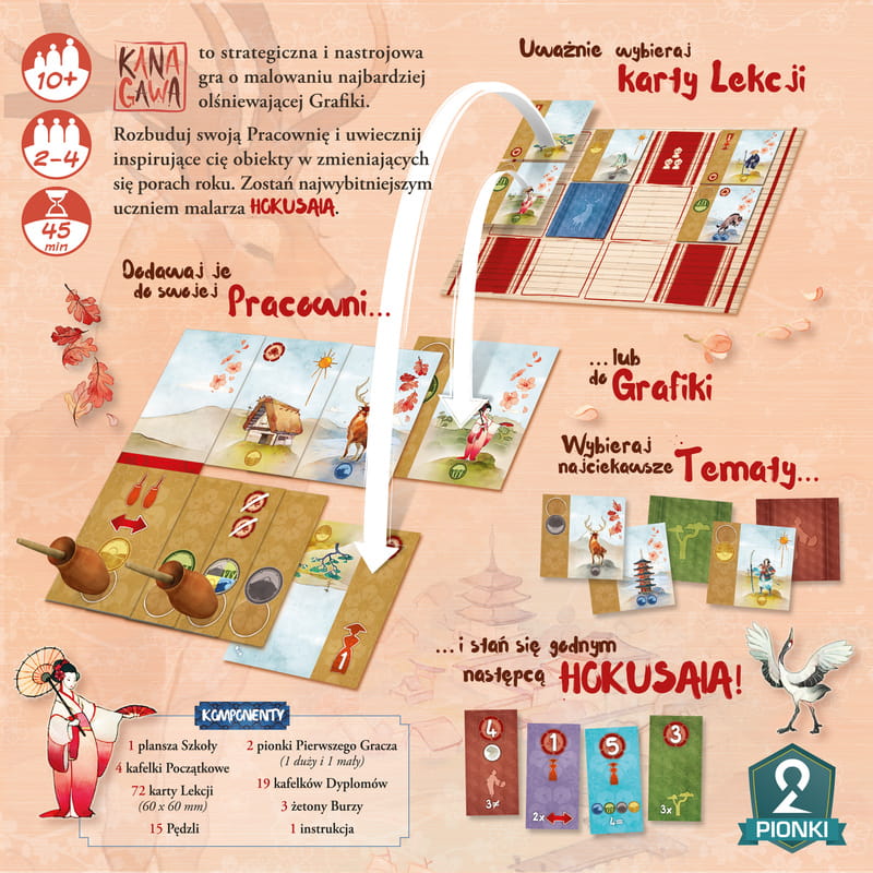 W Kanagawie każdy z graczy wcieli się w artystę – i to nie byle jakiego, a ucznia samego mistrza Hokusaia. W czasie rozgrywki wszyscy uczniowie będą rywalizować o miano najlepszego malarza.