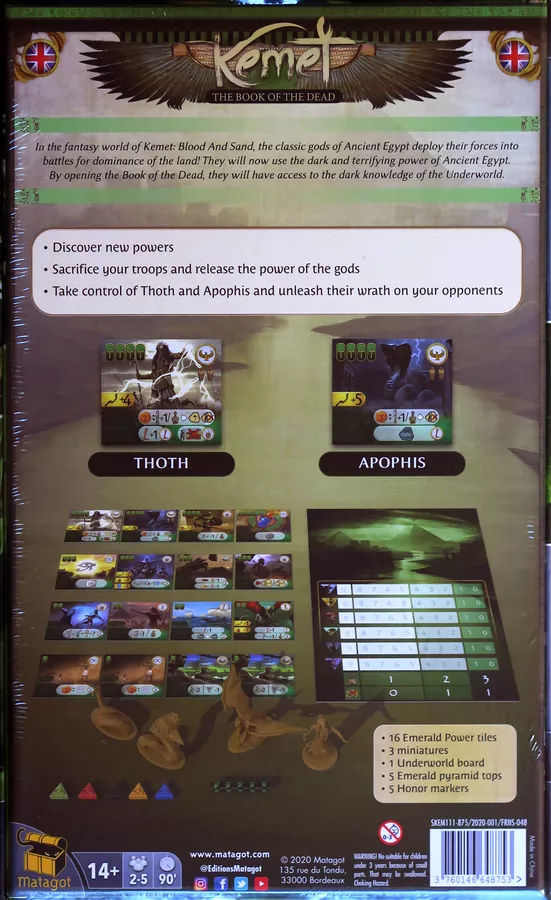 Thanks to the Book of the Dead expansion, you have access to some of the most powerful power tiles in the entire Kemet: Blood and Sand universe. However, access to this terrifying knowledge comes with a cost, as you will have to sacrifice your units to feed the Beyond. By doing so, you'll sink into putrefaction, lose more and more prestige over your opponents, and even part with your precious victory points. This is the price to pay for access to such fearsome abilities and the most frightening of possibilities. Perhaps you will learn to summon the monstrous Apophis, a being of pure evil that dwells in the Underworld. Perhaps you can bend the all-knowing Thoth, the repository of the dark knowledge, to your will. If you are prepared to pay the high price for consorting with such dark forces, they will be formidable allies in your conquest of the black lands of Kemet: Blood and Sand.
