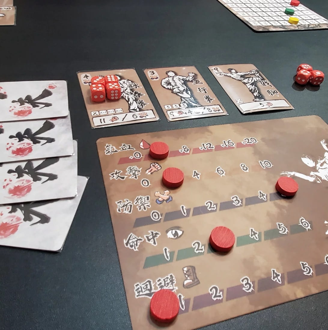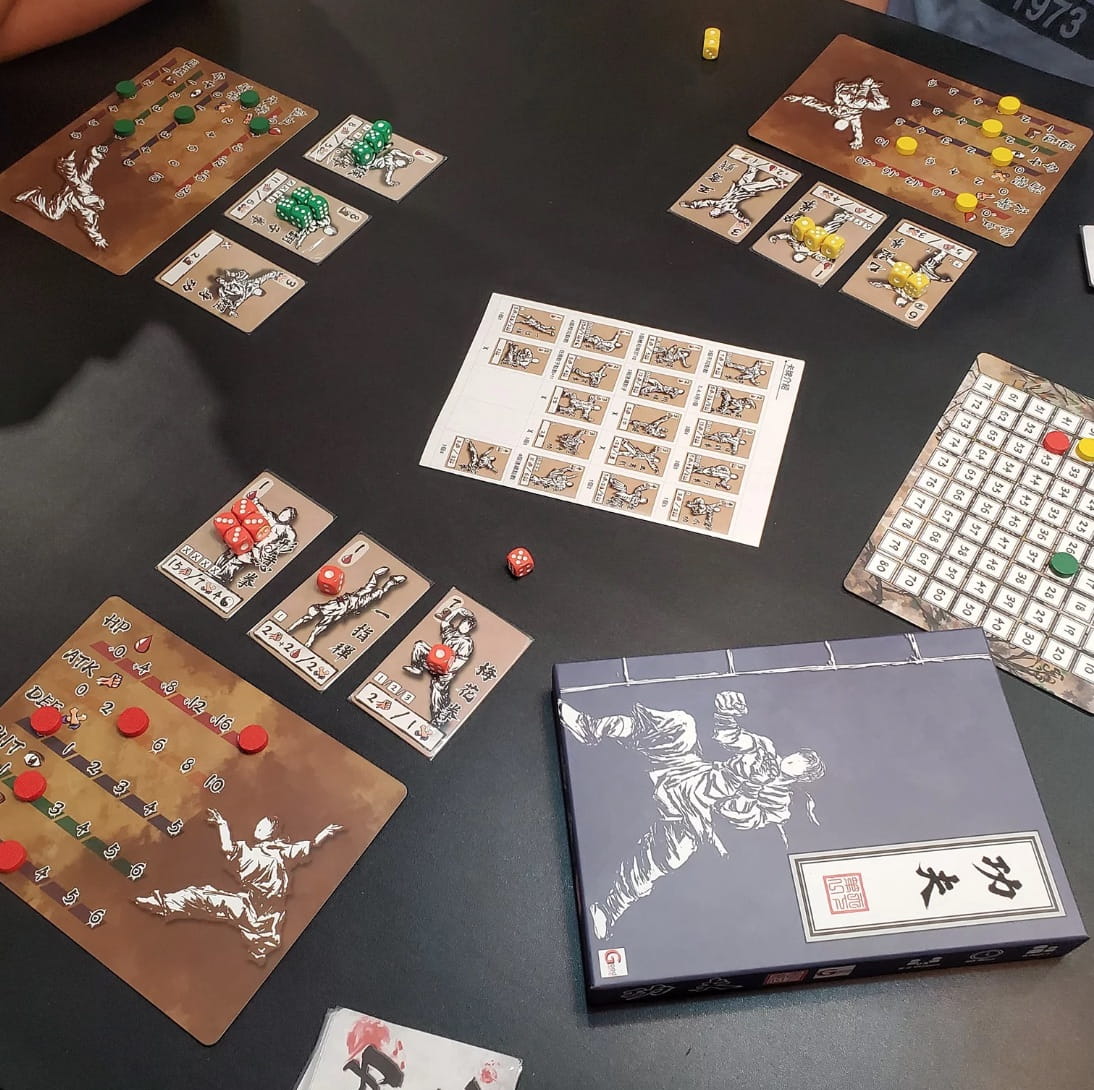 Kung Fu is a dice-driven card game for 2-5 players to compete for the title of Kung Fu Master. After drafting 10 Kung Fu cards and adjusting the initial status, each player will play 3 cards from their hand simultaneously for each round. Based on the overall initiative values, players will take turns to be the attacker while all the others must defend for themselves. During the fight, each player rolls their own 7 dice and assign them in sets to activate their 3 Kung Fu cards to attack or defend. The game ends when there is only one player standing, or after 3 rounds, the player with the most HP remaining, wins the game!