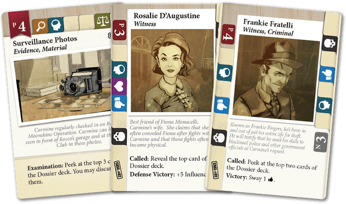 This expansion introduces a Dossier deck. As players win witnesses, they are able to reveal or discard the top card of the Dossier deck. The prosecution needs to prove Carmine's Mafia connections by revealing these Dossier cards while avoiding the powerful criminal activities such as "Jury Tampering" and "Swim with the Fishes" that the defense has shuffled into the deck.
