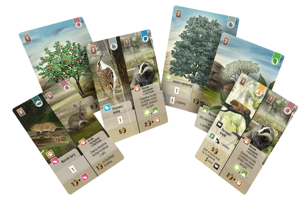 - Drugą grupę stanowią zwierzęta i rośliny. Zagrywamy je w odpowiednich miejscach pod kartami drzew, krzewów i terenów, przestrzegając określonych zasad rozmieszczenia. Karty zwierząt i roślin są podzielone – podczas zagrywania musimy zdecydować, z której strony korzystamy i tę właśnie pozostawiamy widoczną.