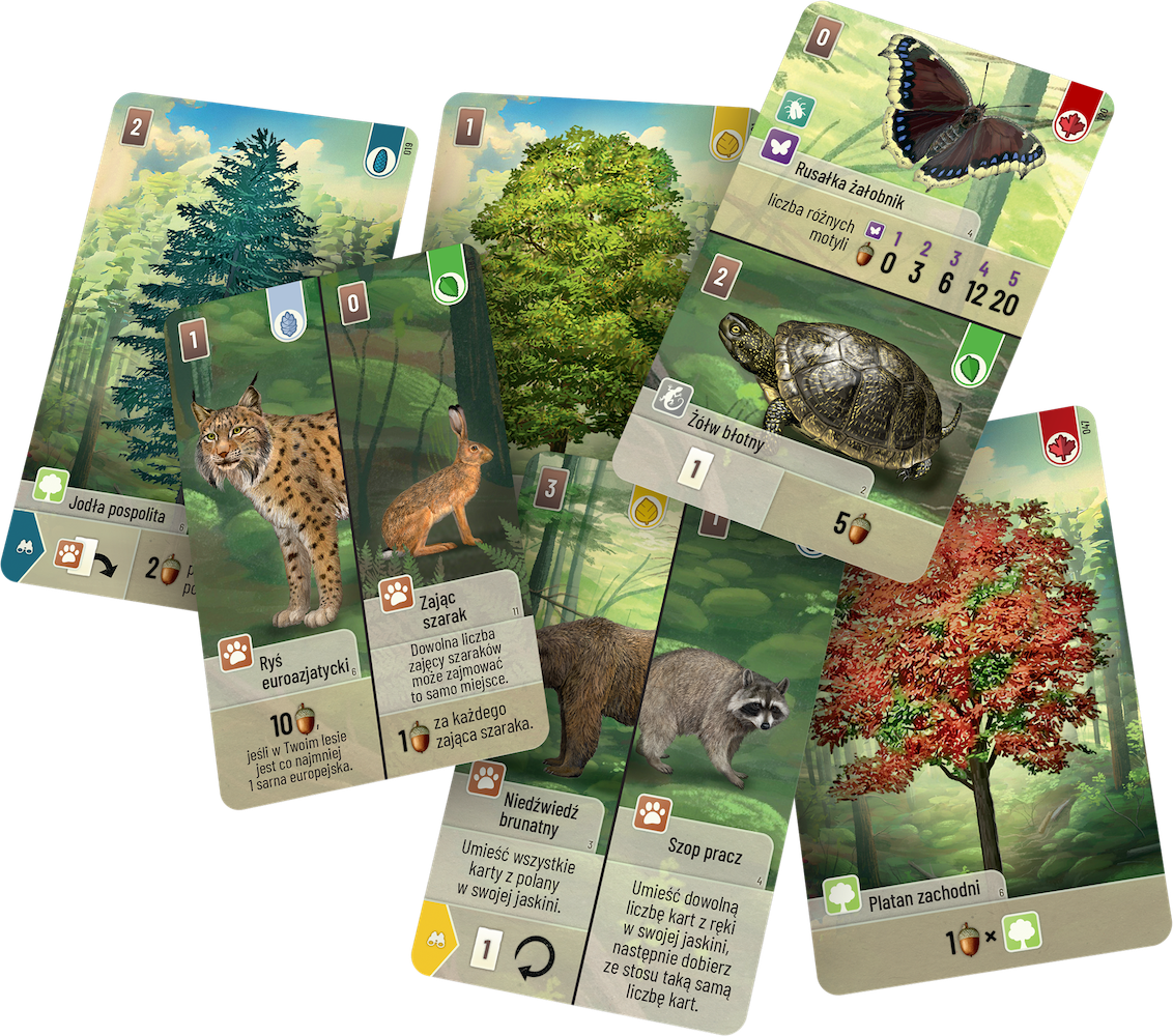 Wśród kart znajdziemy drzewa i zwierzęta. Te pierwsze stanowią podstawę naszego lasu – wokół nich możemy zagrywać rozmaite gatunki. Karty zwierząt są z kolei podzielone i za każdym razem wybieramy, z której strony chcemy skorzystać.