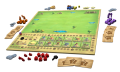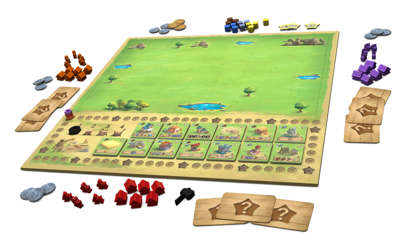 In the game, which lasts four rounds, you can acquire resources such as wood, stones, fish, and wheat from the surrounding squares by putting workers on the board, with three workers being placed each round. When you place a worker, you acquire the resources available in all eight surrounding spaces. You can build buildings by using these resources, and you — or any other player — can gain the effect of the building when place a worker next to it; if you place next to a building owned by another, however, you must pay them a coin before you can collect those resources.