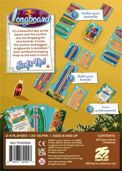 Each board card features 1-3 stickers, which count as points when the surfboard is complete, that is, when it contains at least four cards. When a player has 3-4 complete boards, at least one of which contains 7+ cards, they can choose to end the game. If that doesn't happen before the deck runs out, the game ends at that point. Players then score sticker points on completed boards, lose points for incomplete boards, and score bonus points if they have the longest completed board or the most completed boards or if they have completed any of the four random objective cards put into play at the start of the game.