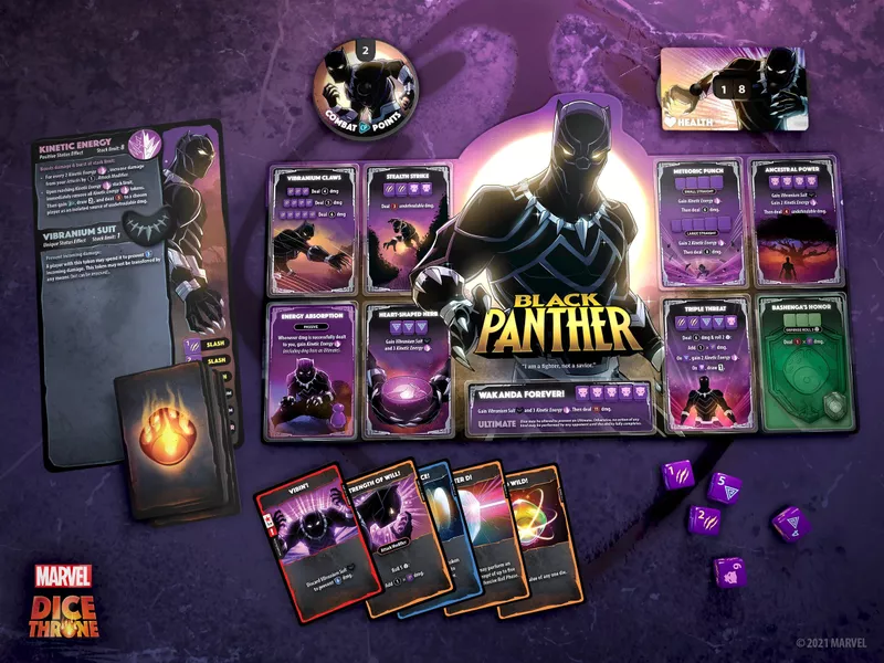 In Marvel Dice Throne, you become one of eight of Marvel's most famous heroes, including Black Panther, Captain Marvel, Black Widow, Scarlet Witch, Loki, Thor, Doctor Strange, and Miles Morales Spider-man! Every Marvel Dice Throne hero was painstakingly designed and balanced to provide the most thematic experience possible, allowing you to truly embody your favorite heroes like no other game. Featuring all-new mechanisms and asymmetrical designs, these are our most innovative and exciting heroes yet.