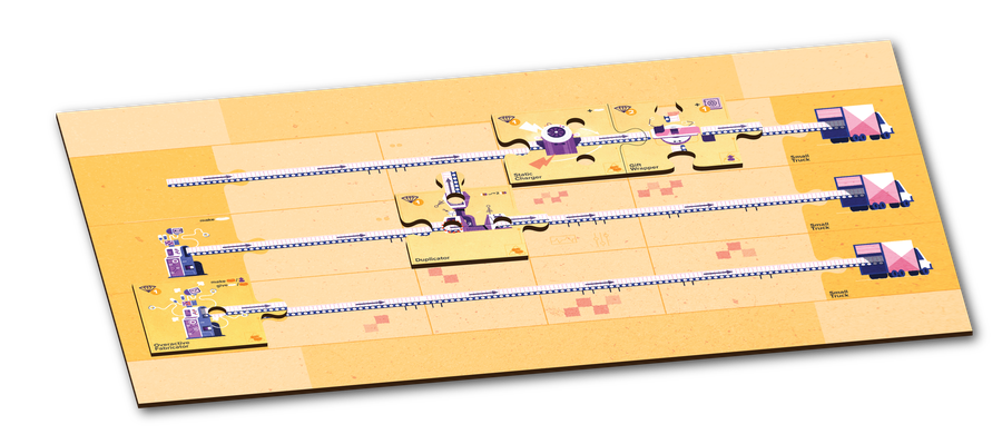 Players compete to buy the best machines for their factory at the best prices while running their factories, shipping out Tidybots for profit, completing specialty bot blueprints to fill their vaults with money, and turning the rotating shop wheel.