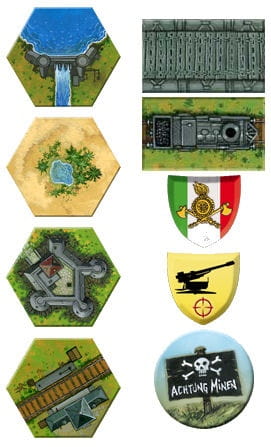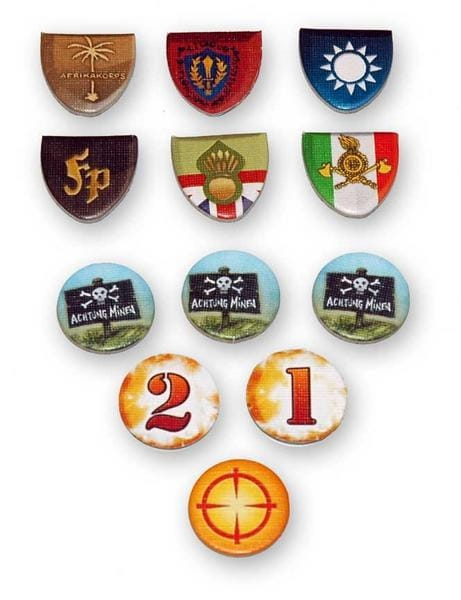 - 22 żetonów obiektów - m.in. stacja przeładunkowa, elektrownia, obóz jeńców, stacja radarowa, latarnia morska, lotnisko, koszary, cmentarz, fabryka, forteca, afrykańska wioska, ...