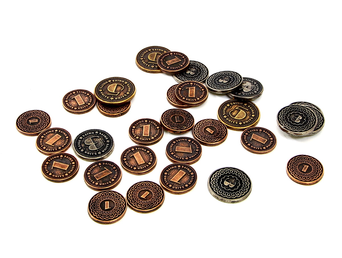 Wykonany ze stopów cynku zestaw 24 masywnych, ale precyzyjnie zdobionych monet, które doskonale zastępują najistotniejsze elementy każdej gry ekonomicznej.