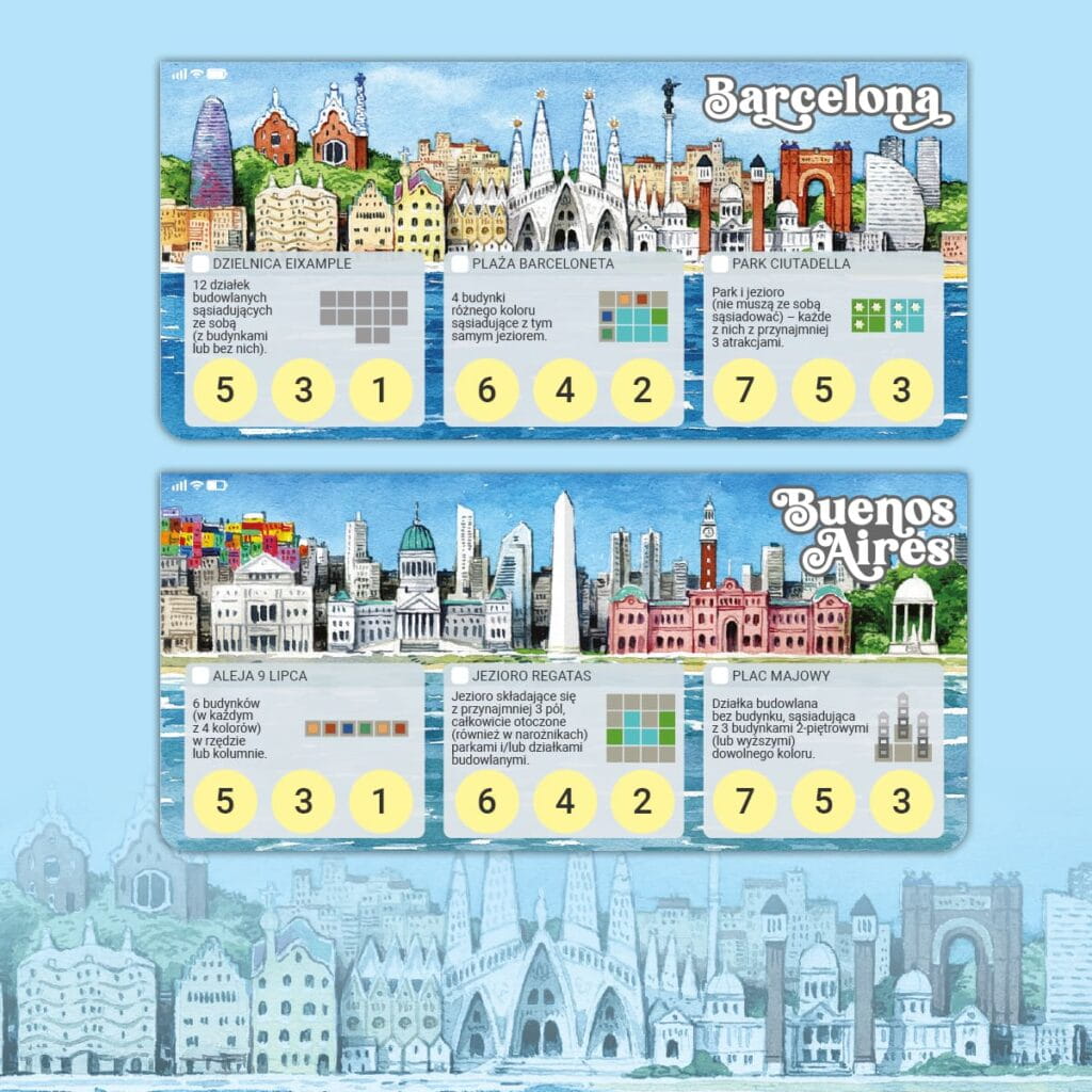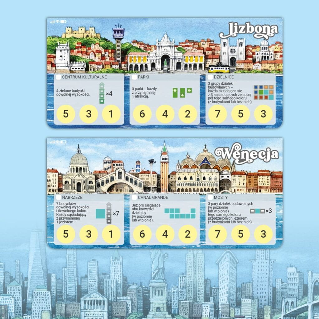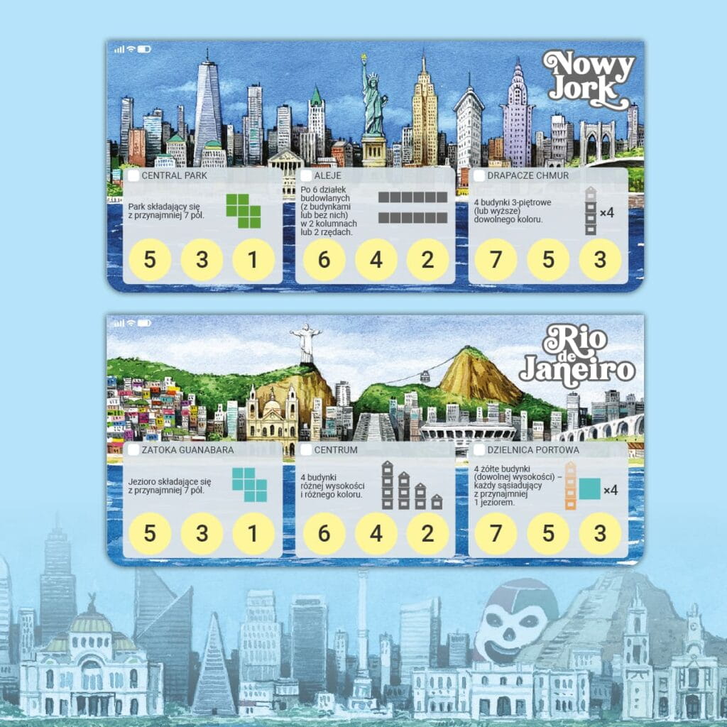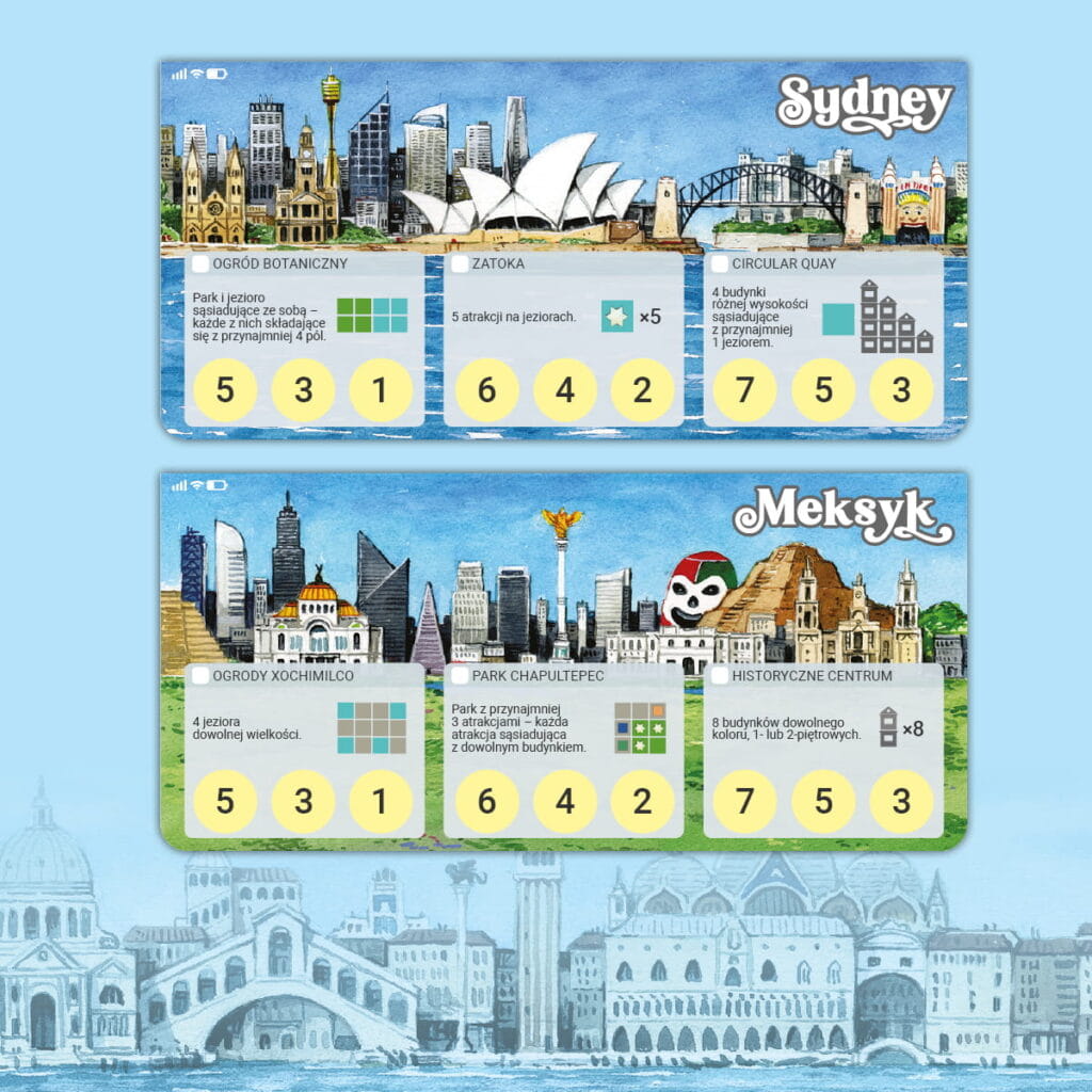 Proste zasady + strategiczne myślenie. Każda rozgrywka jest inna. Do wyboru macie 8 miast: Barcelonę, Wenecję, Sydney, Nowy Jork, Rio de Janeiro, Lizbonę, Meksyk i Buenos Aires.