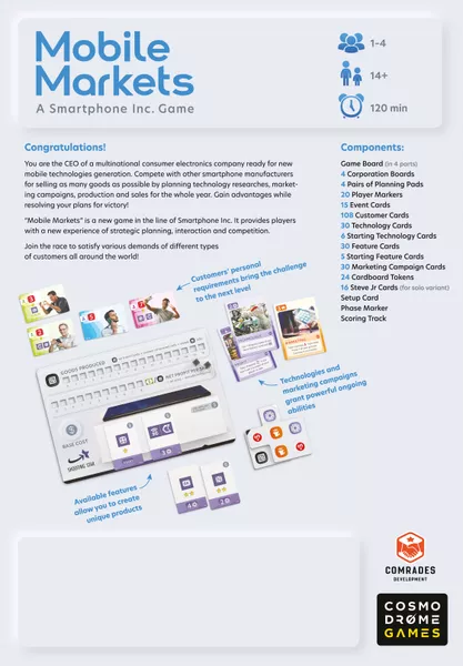 Mobile Markets is a new stand-alone game in the line of Smartphone Inc. providing a similar game experience as the Smartphone Inc. (2018). But it offers players new mechanics, more complexity and strategic planning, interaction, and competition.