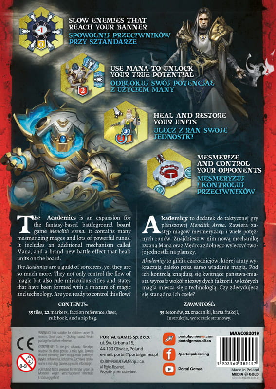 Akademicy to dodatek do taktycznej gry planszowej Monolith Arena. Zawiera zastęp magów mesmeryzacji i wiele potężnych runów. Znajdziesz w nim nową mechanikę zwaną Maną oraz Mędrca zdolnego wyleczyć twoje jednostki na planszy. Akademicy to gildia czarodziejów, której atuty wykraczają daleko poza samo władanie magią. Pod ich kontrolą znajdują się kwitnące państwa-miasta wyrosłe wokół niezwykłych faktorii, w których magia miesza się z technologią. Czy zdecydujesz się stanąć na ich czele?