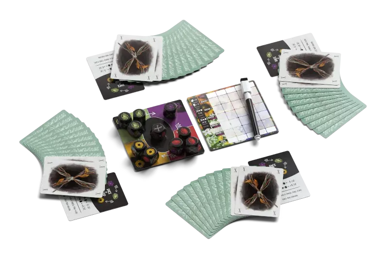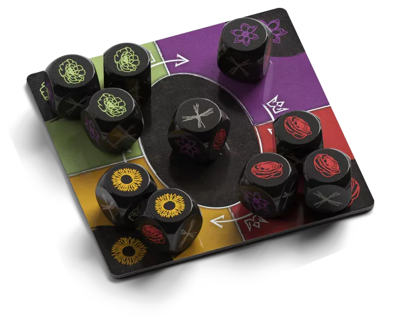 Mori is a quick-playing trick-taking game that asks players to carefully manipulate their hand of cards by playing tricks and using dice to find their way to the best possible score.