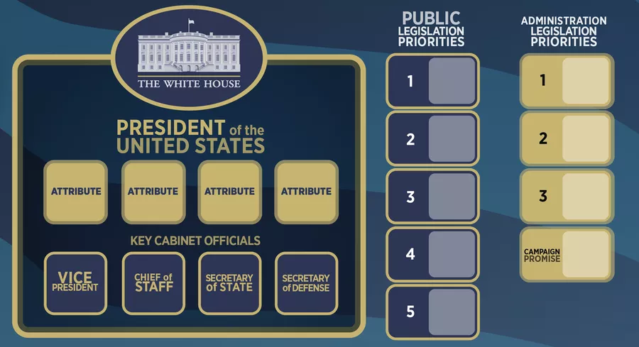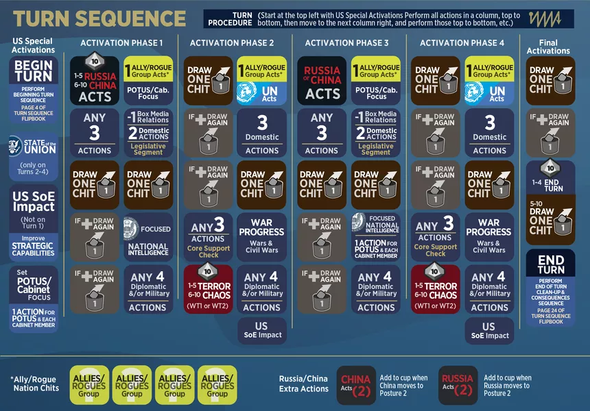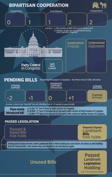 Mr. President is a solitaire game about governing as the President of the United States in the early 21st century. It's not an election game. It begins after you've been elected. It's about sitting in The Chair and trying to advance your agenda while navigating ongoing crises, political enemies, public opinion, your relations with Congress and the press, and keeping your country secure in a world of rival nations and agendas that just seems to keep blowing up around you.