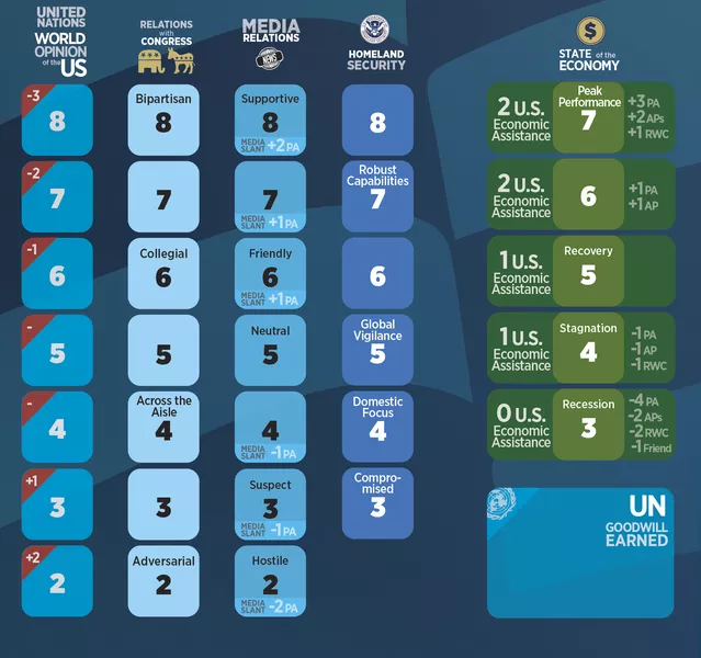 Mr. President is a resource management game, where you never have enough resources to achieve your entire agenda, and the path you take through an always unpredictable storyline rests on the choices you make. Depending on the results of those choices, and on the unfolding of a "different every game" story, you'll either be thinking "POTUS? Piece of Cake!" or "Why was it that I WANTED this job?" many times in each game.