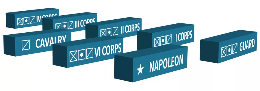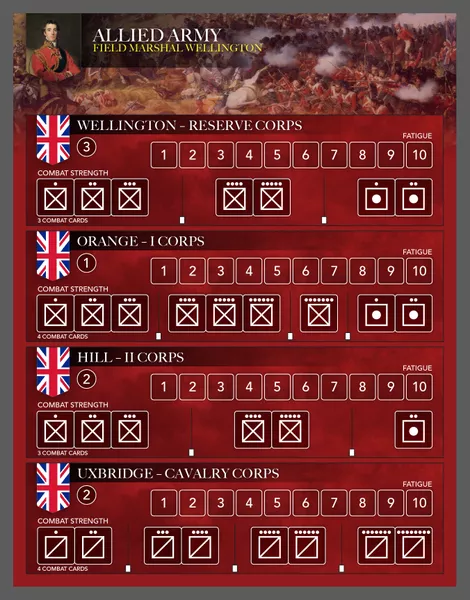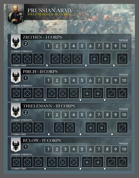 Each side receives a set number of action points to move pieces and battle. Each piece on the board is a corps in the French, Anglo-Allied, and Prussian armies, so each side has 4 - 8 pieces on board. As your pieces move they will gain fatigue, and as they battle they gain fatigue and casualties.