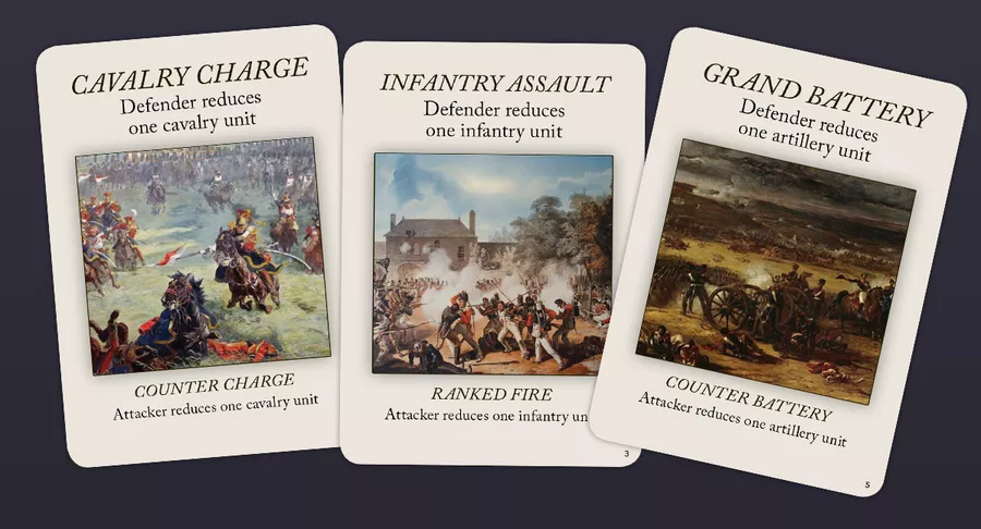 The battle system is card play, matching the cards played based on the type of units in the corps (infantry, cavalry, or artillery). Victory is determined by the capture of terrain and eliminating enemy units.
