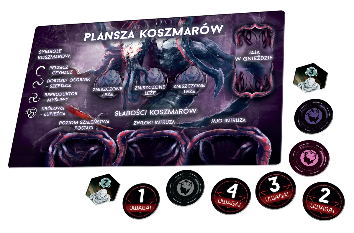 Dodatek Koszmary wprowadza do rozgrywki nową rasę intruzów i nową mechanikę szaleństwa postaci. W pudełku znajdziesz zestaw fantastycznych figurek koszmarów, żetony, a także nowe karty wydarzeń i karty paniki.