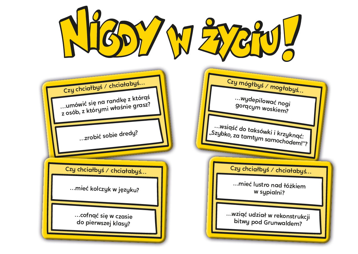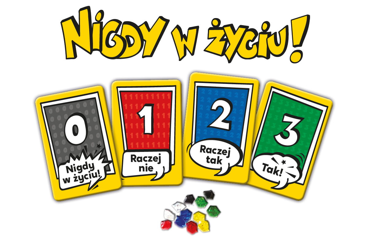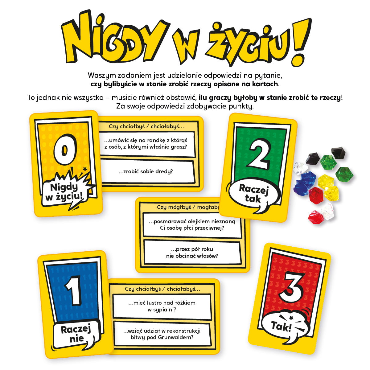 Nigdy w życiu! to świetna gra imprezowa dla dorosłych graczy. Musicie obstawiać, kto z Was byłby w stanie zrobić rzeczy podane na kartach. Wygra osoba z największą liczbą punktów.