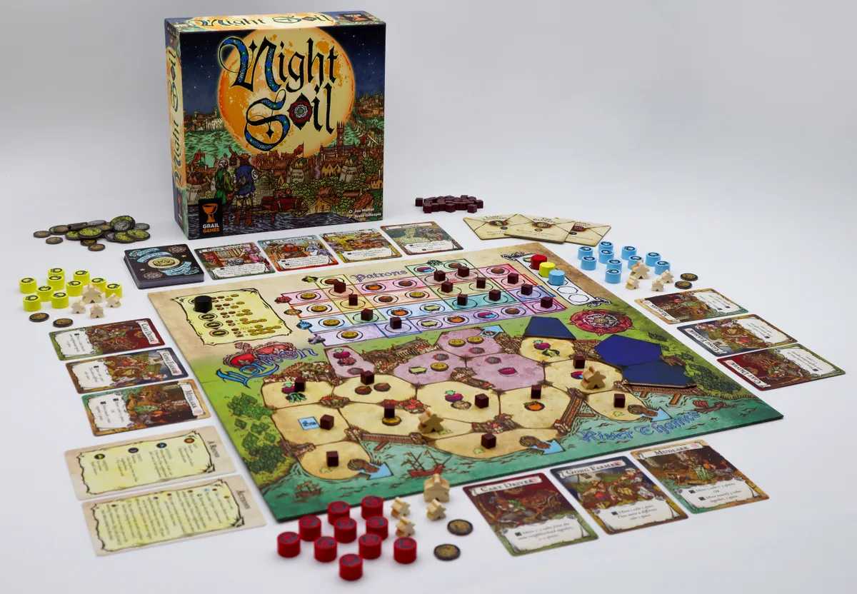 Night Soil to nietuzinkowa, dojrzała tematycznie gra planszowa osadzona w realiach Londynu epoki Tudorów (1485–1603). Miasto, będące symbolem postępu kulturowego Europy, zmaga się z bardzo przyziemnym problemem — brakiem kanalizacji. Ulice stopniowo wypełniają się nieczystościami, a ktoś musi nad tym zapanować… najlepiej z zyskiem.