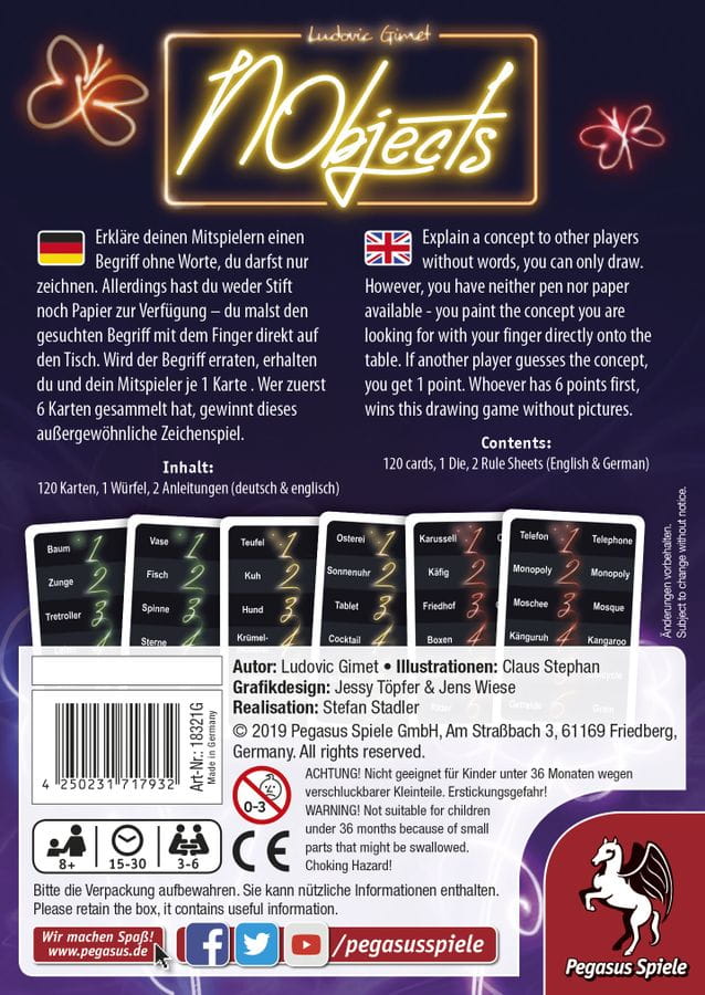 In Nobjects, a die and a card that shows six topics determine what you need to draw for other players to guess, but you're not drawing with pencils, chalk, or other materials. Instead, you draw solely with your fingers on the table, creating a picture with invisible lines that others try to put together in their heads to guess. Whoever recognizes the term will then become the artist for the next round.