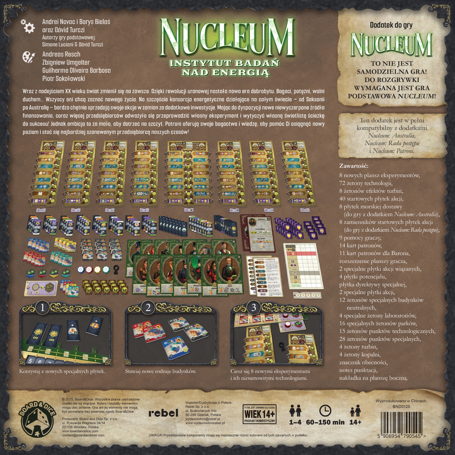 Nucleum: Instytut Badań nad Energią to rozszerzenie wprowadzające 8 nowych eksperymentów o różnym poziomie trudności, które będą ciekawym wyzwaniem i urozmaiceniem dla doświadczonych graczy. Oprócz tego w pudełku znajdziemy nowe specjalne płytki i nowe rodzaje budynków, a także karty patronów o potężnych zdolnościach, których możemy używać, płacąc punktami.
