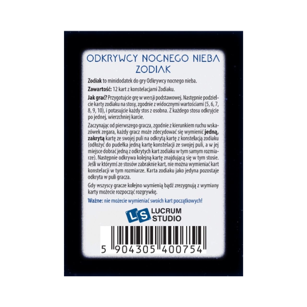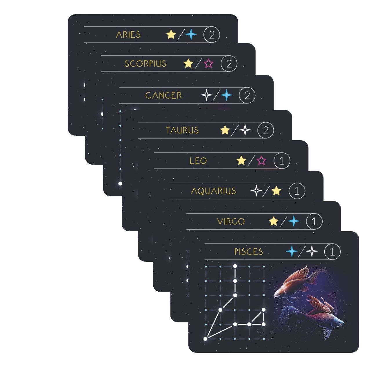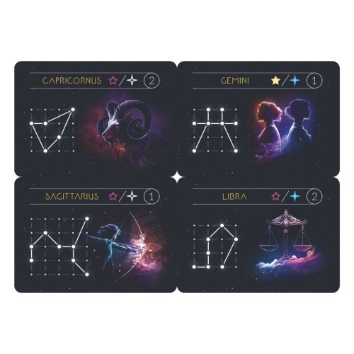 Odkrywaj kolejne fragmenty nocnego nieba, teraz urozmaicone o konstelacje Zodiaku! Wypatruj potrzebnych ci gwiazd i precyzyjnie kreśl najciekawsze konstelacje! Uważaj jednak, aby większe gwiazdozbiory nie przysłoniły blasku tych mniejszych. Każda karta w grze przedstawia jedną z najbardziej znanych konstelacji gwiazd. Twoim zadaniem będzie nanosić je na swoją mapę – pamiętaj jednak o specjalnych astronomicznych regułach!